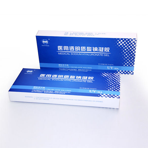 1.5% το οφθαλμικό πήκτωμα 1.0ml Hyaluronate νατρίου γεμίζεται εκ των προτέρων με ένα φυσιολογικά ισορροπημένο διάλυμα ύδατος του νατρίου hyaluronate σε μια σύριγγα. Ο κώνος συρίγγων καλύπτεται με μια προστατευτική ΚΑΠ και η συσκευασία είναι εξοπλισμένη με μια ξεπλένοντας βελόνα στη σακούλα. Το προϊόν είναι αποστειρωμένο μέσω της αποστείρωσης διήθησης και του αποστηρωμένου ελέγχου διεργασίας, και μπορεί να χρησιμοποιηθεί μιά φορά.